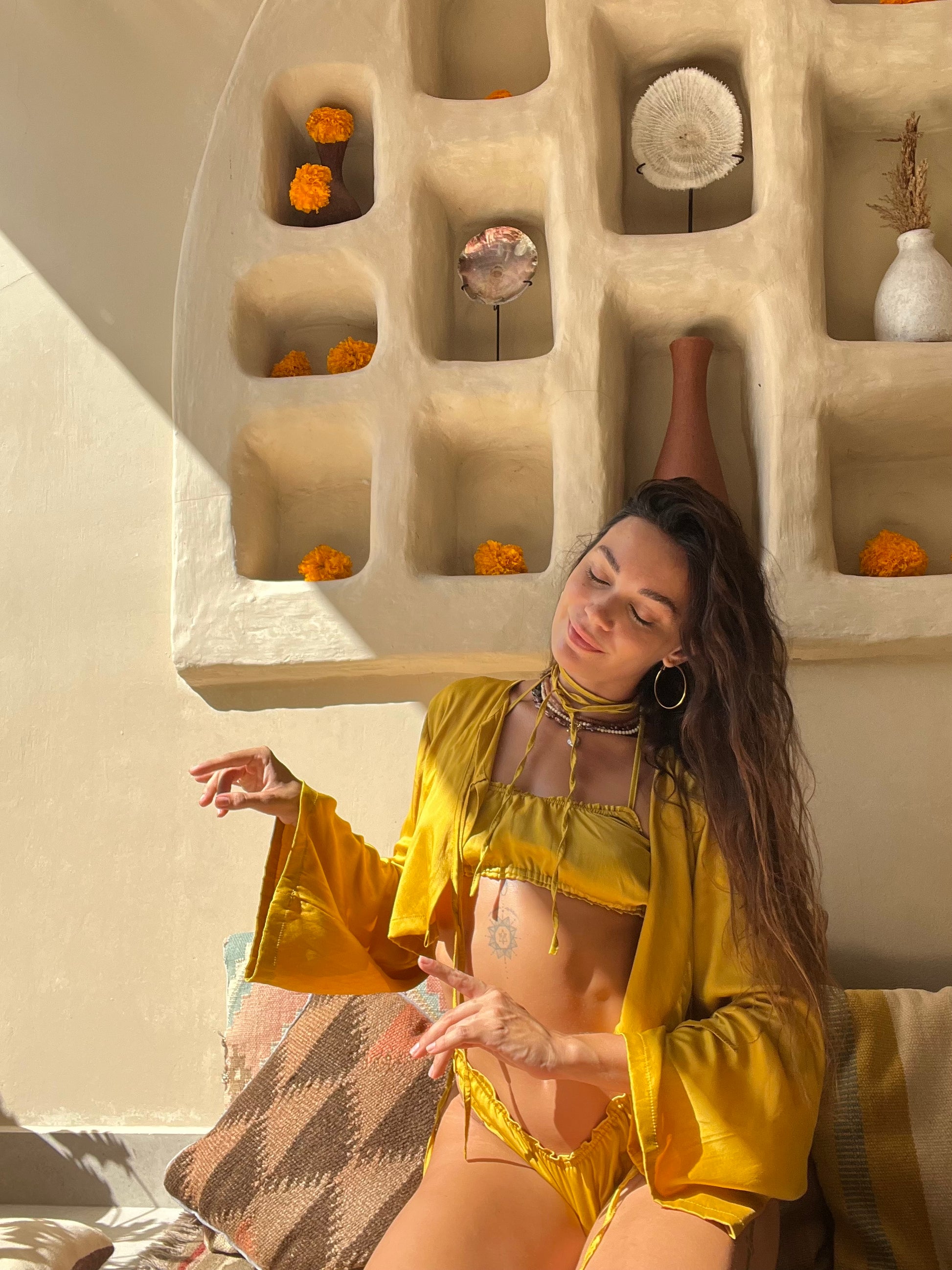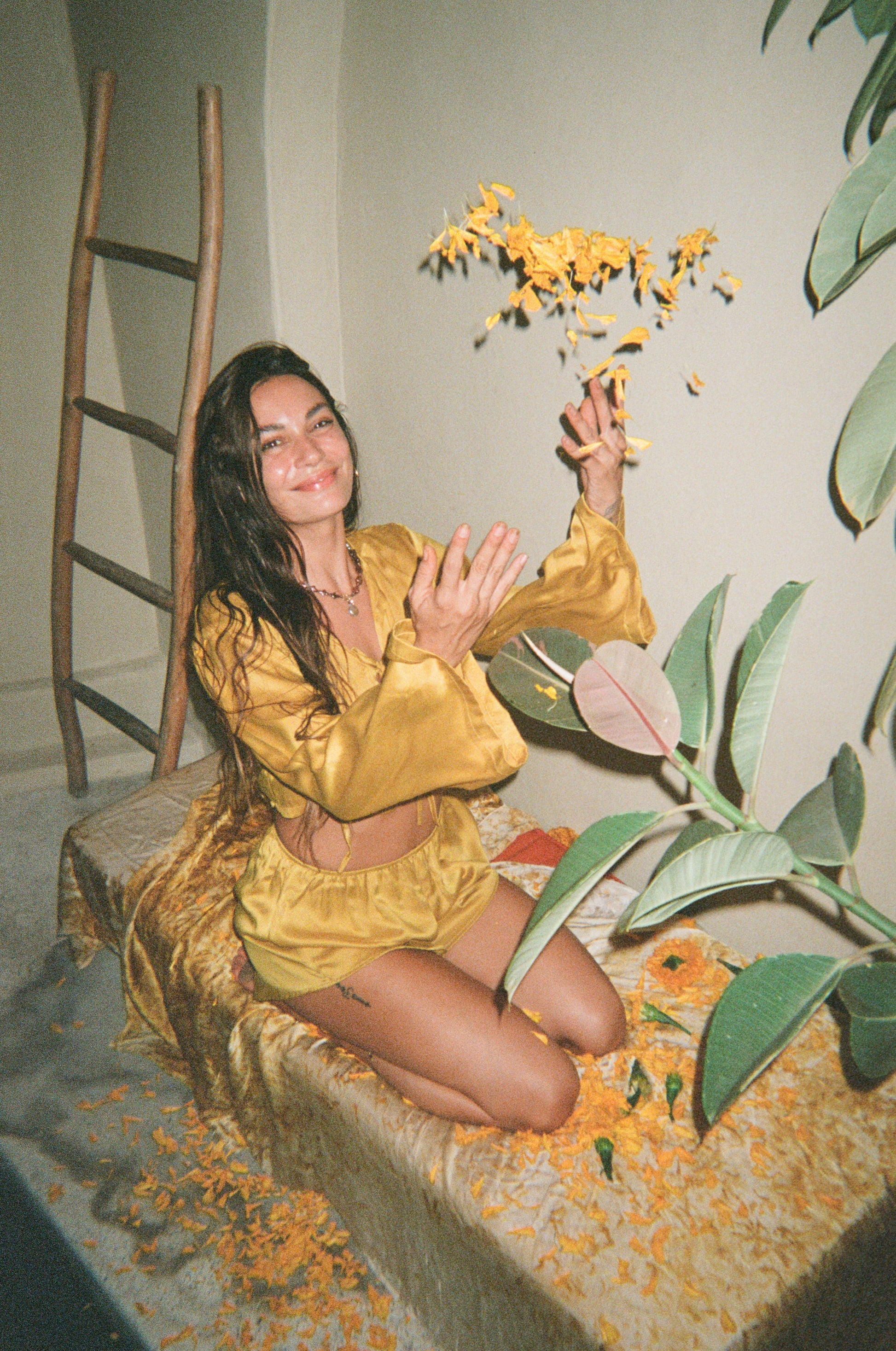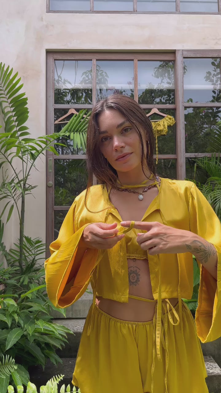 A silky set designed with the intention to help you embody your wings. The Mariposa top features sleeves that drip to your wrist while the shorts have a slight flare for your flight. Together it is a complete fit ripe for full on metamorphosis. These plant dyed adornments are ready to carry your from day to night with the most comfort, grace, and luxury.