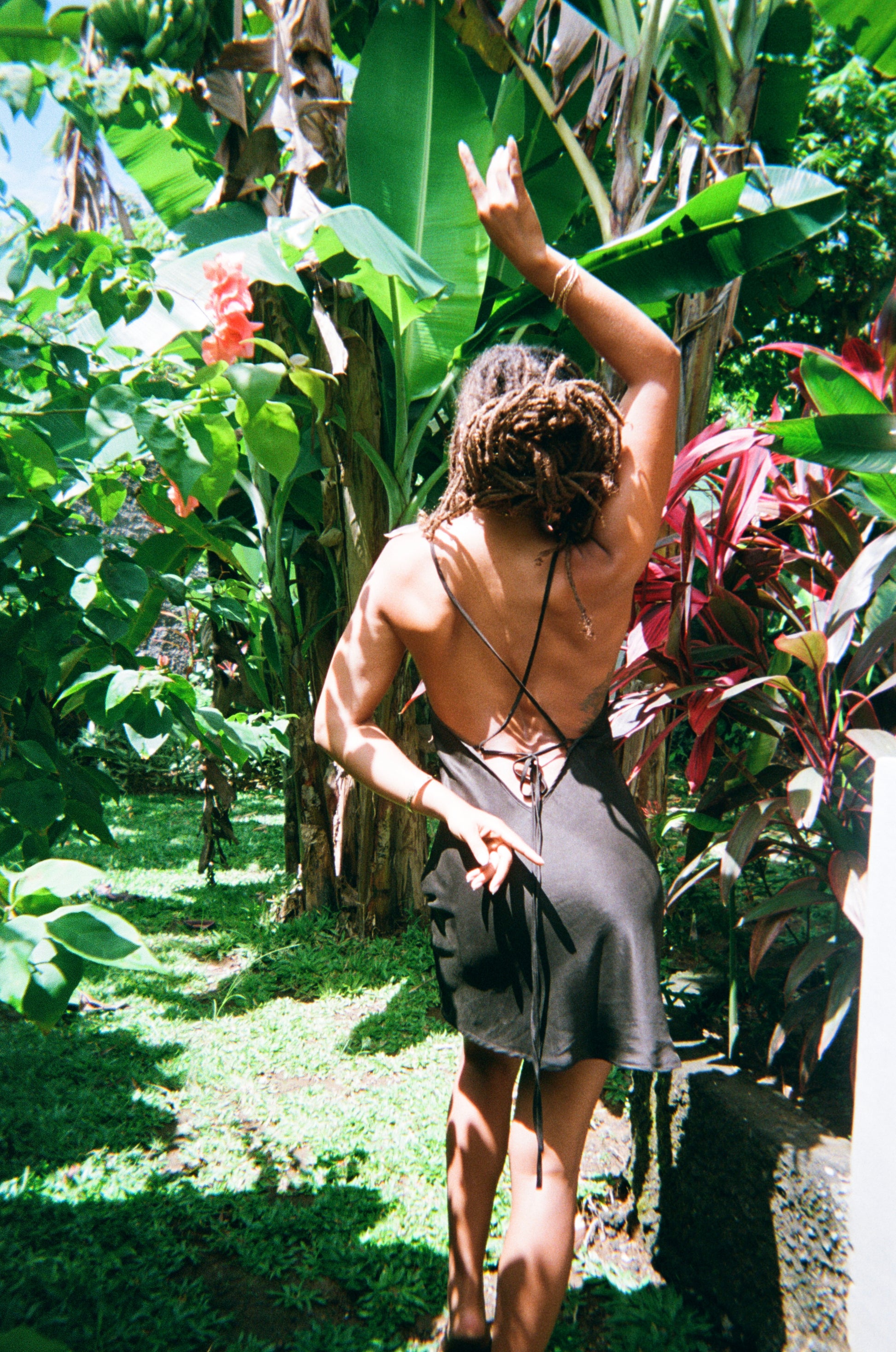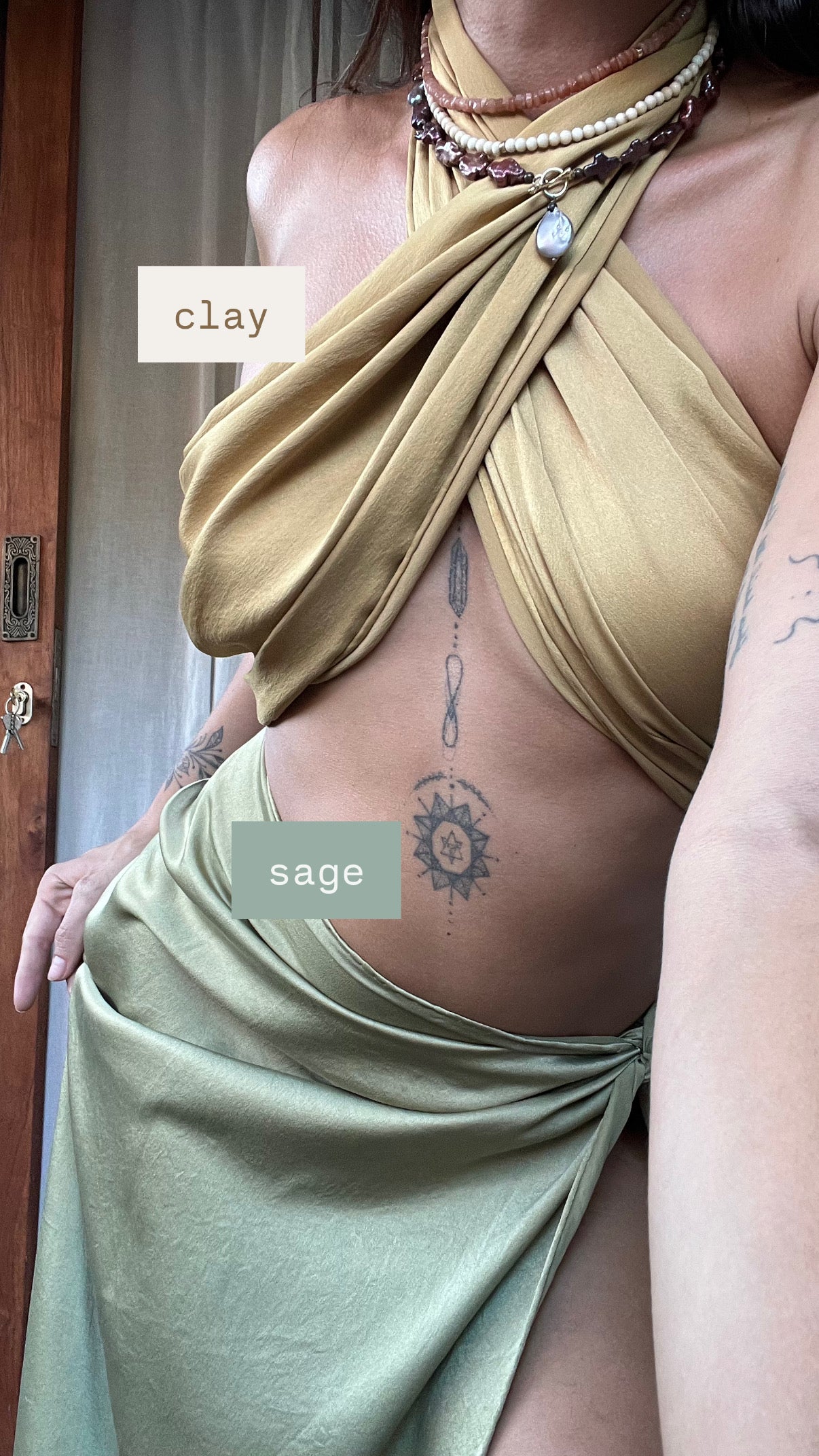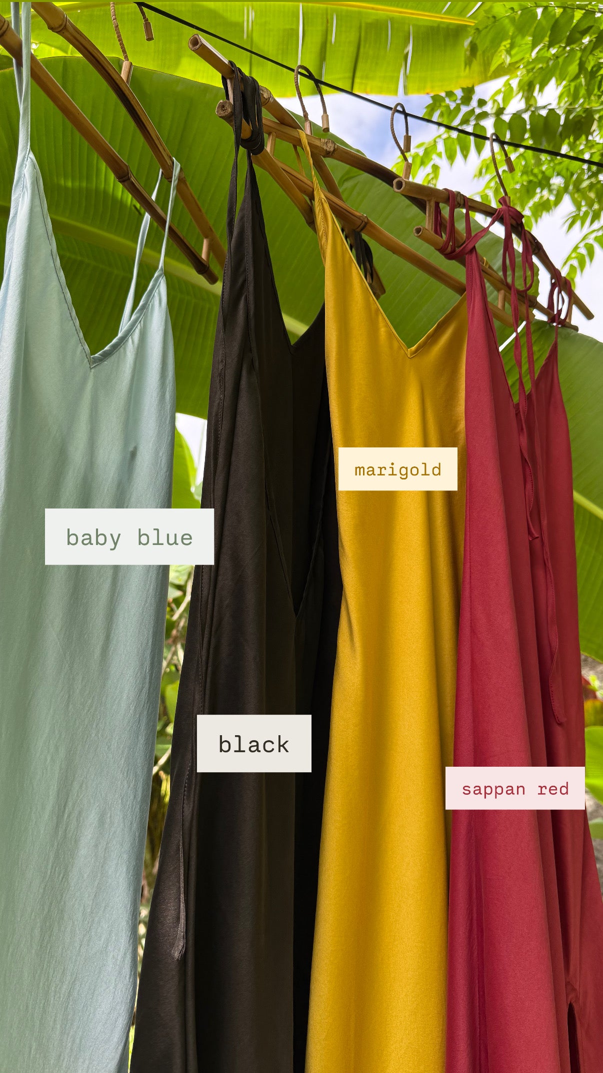 This custom order dress is a true invitation into cocreation! With multiple many plant dyed possibilities, you can truly customize the perfect adornment for YOU. The dress features meter long straps and hidden loops along a low back for even more limitless ways to tie and style.
